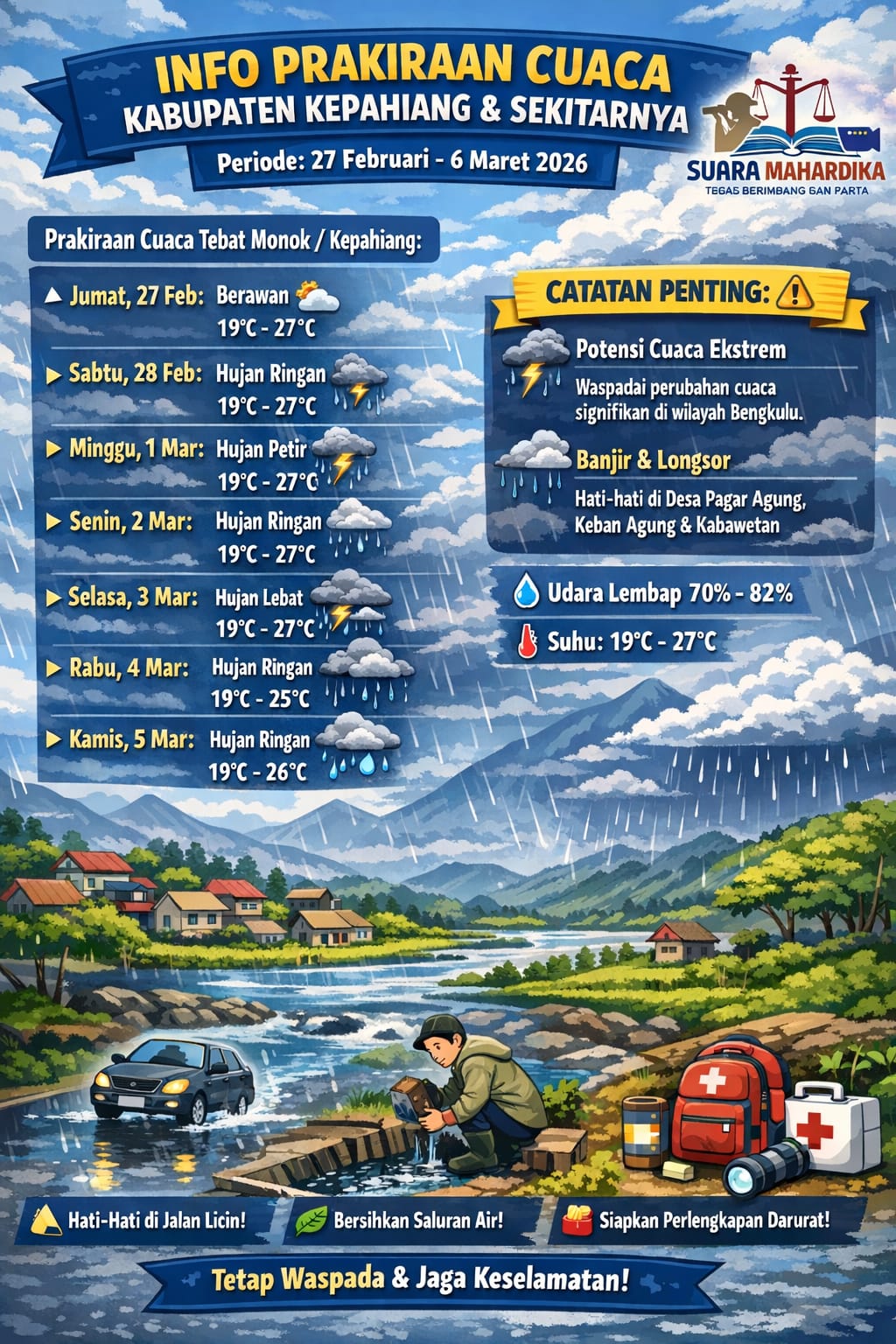 📌 Berdasarkan imbauan dari Badan Meteorologi, Klimatologi, dan Geofisika, terdapat potensi perubahan cuaca signifikan di wilayah Bengkulu, termasuk Kabupaten Kepahiang.