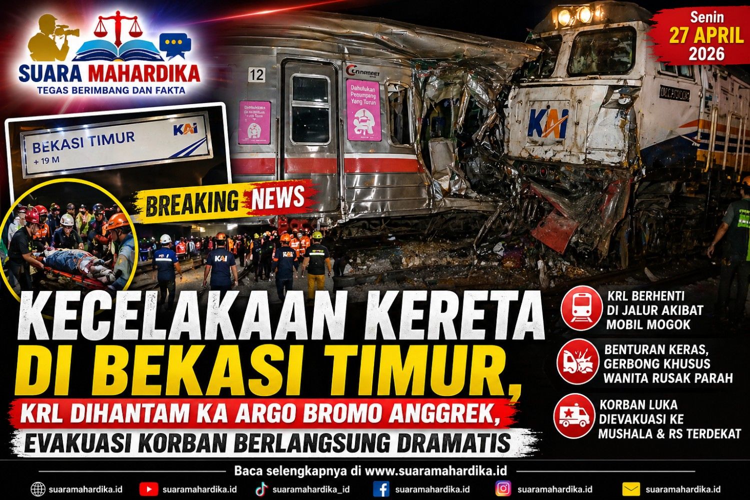 Bekasi Timur, suaramahardika.id – Kecelakaan hebat terjadi di jalur perkeretaapian wilayah Bekasi Timur pada Senin (27/4/2026) malam. Insiden tersebut melibatkan rangkaian KRL Commuter Line tujuan Bekasi dan Kereta Api jarak jauh Argo Bromo Anggrek yang menabrak dari arah belakang.