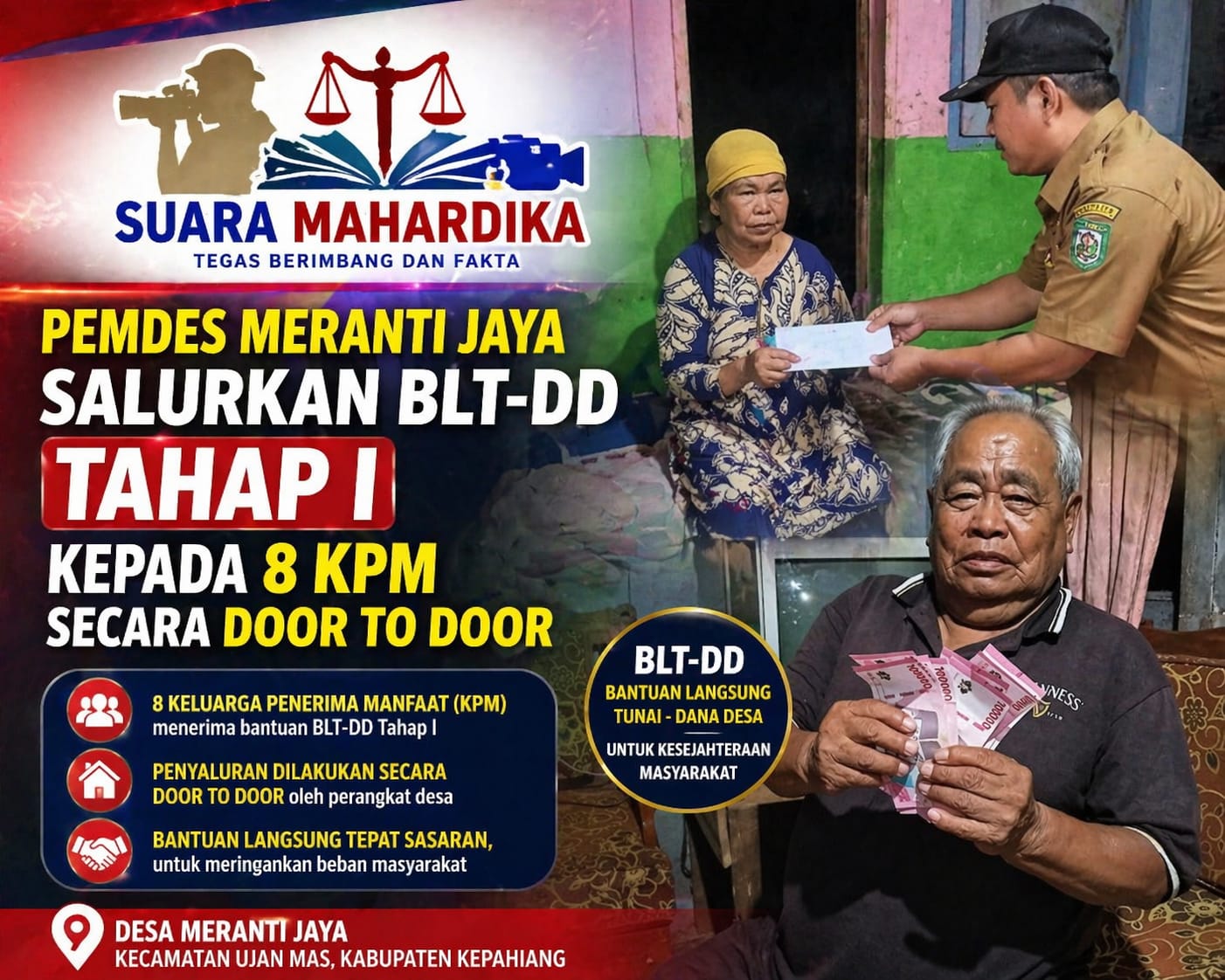 Kepahiang, suaramahardika.id – Pemerintah Desa (Pemdes) Meranti Jaya, Kecamatan Ujan Mas, Kabupaten Kepahiang, menyalurkan Bantuan Langsung Tunai Dana Desa (BLT-DD) tahap I kepada 8 Keluarga Penerima Manfaat (KPM).